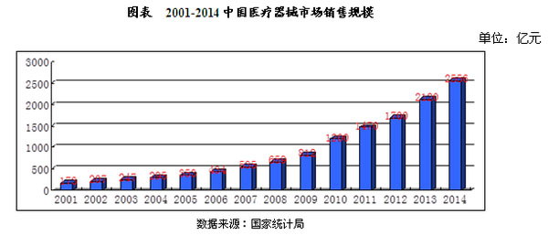 2014全年全國醫(yī)療器械銷售規(guī)模約2556億元,比2013年度的2120億元增長了436億元,增長率為20.06%。