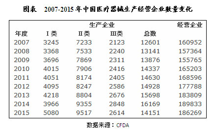 CFDA發(fā)布了《2015年度食品藥品監(jiān)管統(tǒng)計(jì)年報(bào)》顯示截至2015年11月底,全國實(shí)有醫(yī)療器械生產(chǎn)企業(yè)14151家,其中:Ⅰ類5080家,Ⅱ類9517家,Ⅲ類2614家。全國共有實(shí)施許可證管理的(二類、三類)醫(yī)療器械經(jīng)營企業(yè)186269家。經(jīng)營二類醫(yī)療器械產(chǎn)品的企業(yè)125197家,經(jīng)營三類醫(yī)療器械產(chǎn)品的企業(yè)121984家。
